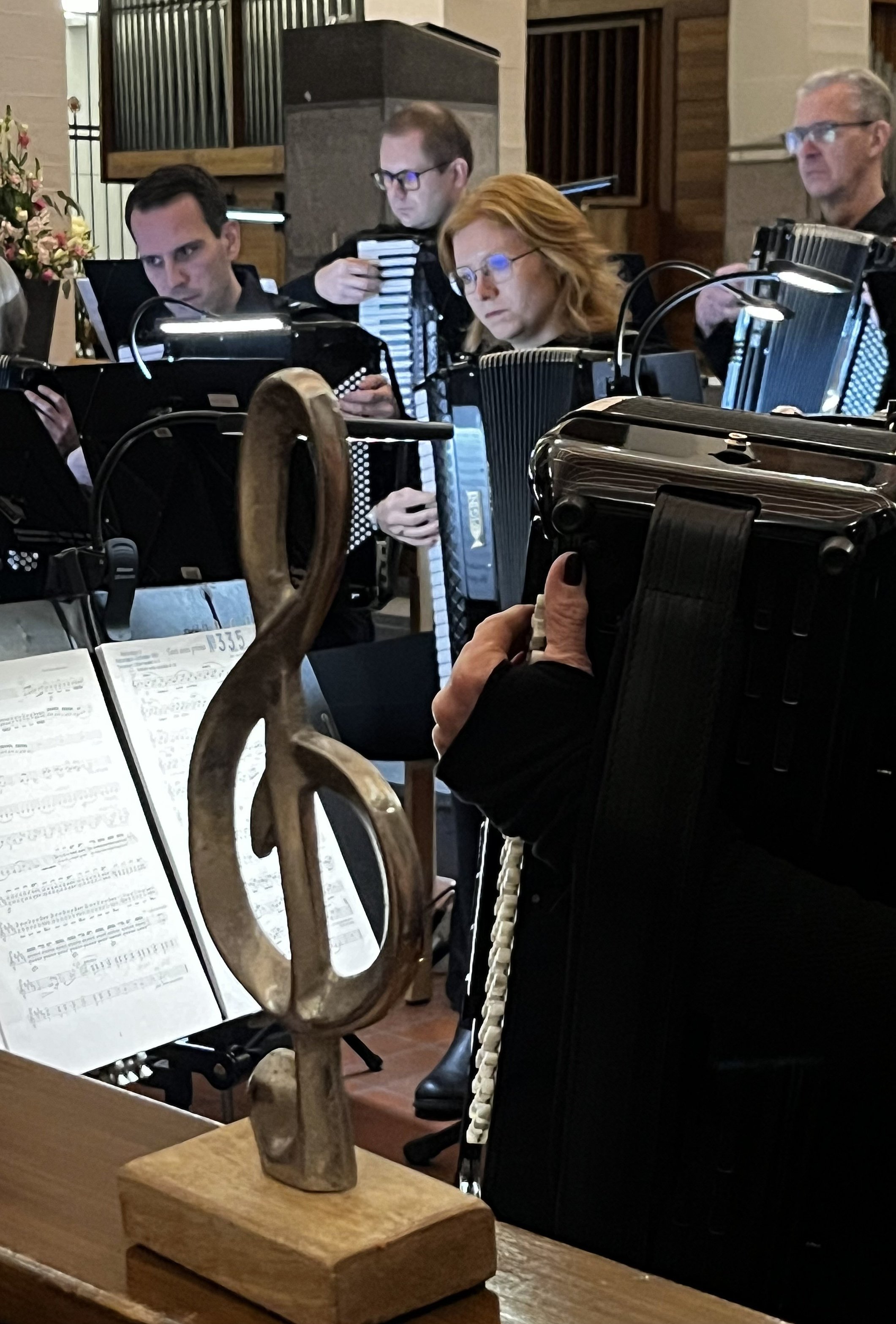 Fotos: Die Skulptur “Instrument des Jahres” und Musikerinnen des Akkordeon Orchesters 1980 Dinslaken/Oberhausen am 23. November 2025 in St. Martini Wesel; Martina Schubert und Matthias Hennecke vom Deutschen Harmonikaverband NRW, Ralf Kaupenjohann und Tatjana Pereswetow vom Akkordeonlehrerverband NRW erhalten die Skulptur “Instrument des Jahres” von Regina van Dinther, Präsidentin des Chorverbands NRW und Vizepräsidentin des Landesmusikrats NRW; Niederrheinischer Kammerchor und Akkordeon Orchester 1980 Dinslaken/Oberhausen interpretieren das Requiem von Maurice Duruflé am 23. November 2025 in St. Martini Wesel; Johannes Burgard und Peter Winking mit Astor Piazzollas “Ave Maria”; Fotos: LMR NRW