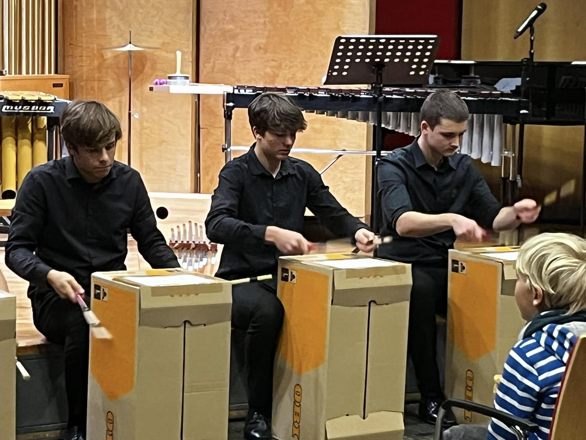 Fotos: Das Kinderorchester NRW mit Dirigent György Mészáros und Moderator Ralph Erdenbergera beim Tag der Landesjugendensembles am 16. November 2025 im Konzertsaal der Hochschule für Musik und Tanz Köln; Musik von SPLASH: Perkussion NRW im Kammermusiksaal der Hochschule; Blechbläserquintett des Kammermusikzentrums NRW, der Landesjugendchor NRW und das Jugendzupforchester NRW im Kammermusiksaal der Hochschule; Fotos: LMR NRW.