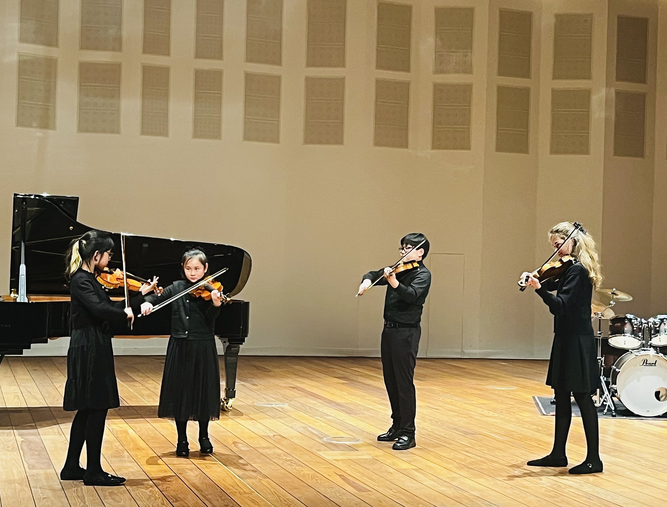Nach der ersten Ergebnisbekanntgabe folgte ein unterhaltsamer und eindrucksvoller Ensemblemoment: Die jungen Geigerinnen und Geiger Xinyue Jiang, Jakob Yihan Li, Hannah Unzen (alle aus Mönchengladbach) sowie Lizzy Chenxi Xu (Neuss) präsentierten gemeinsam das „Gruselett“ von Agnes Dorwarth. Ihr Zusammenspiel war geprägt von großer Aufmerksamkeit füreinander und einer lebendigen Umsetzung des humorvoll-skurrilen Charakters der Morgenstern-Vertonung.
