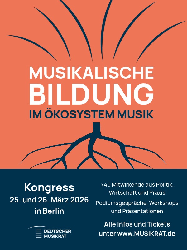 Der Deutsche Musikrat lädt zum Kongress „Musikalische Bildung im Ökosystem Musik“ ein, der am 25. März (11:00-21:30 Uhr) und 26. März 2026 (9:00-16:00 Uhr) in der Universität der Künste Berlin (Bundesallee 1-12, 10719 Berlin) stattfinden wird.