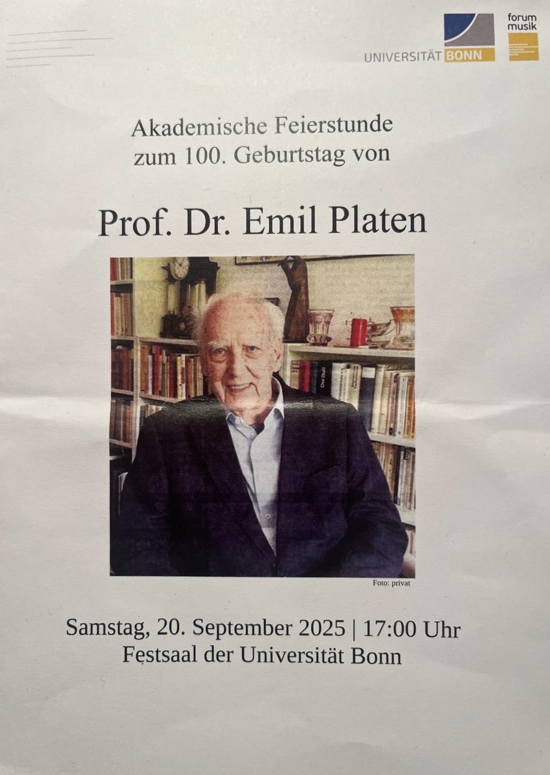 Foto: Programmblatt der Feierstunde für Emil Platen, 20.9.2025; Foto: Matthias Pannes, Münster.