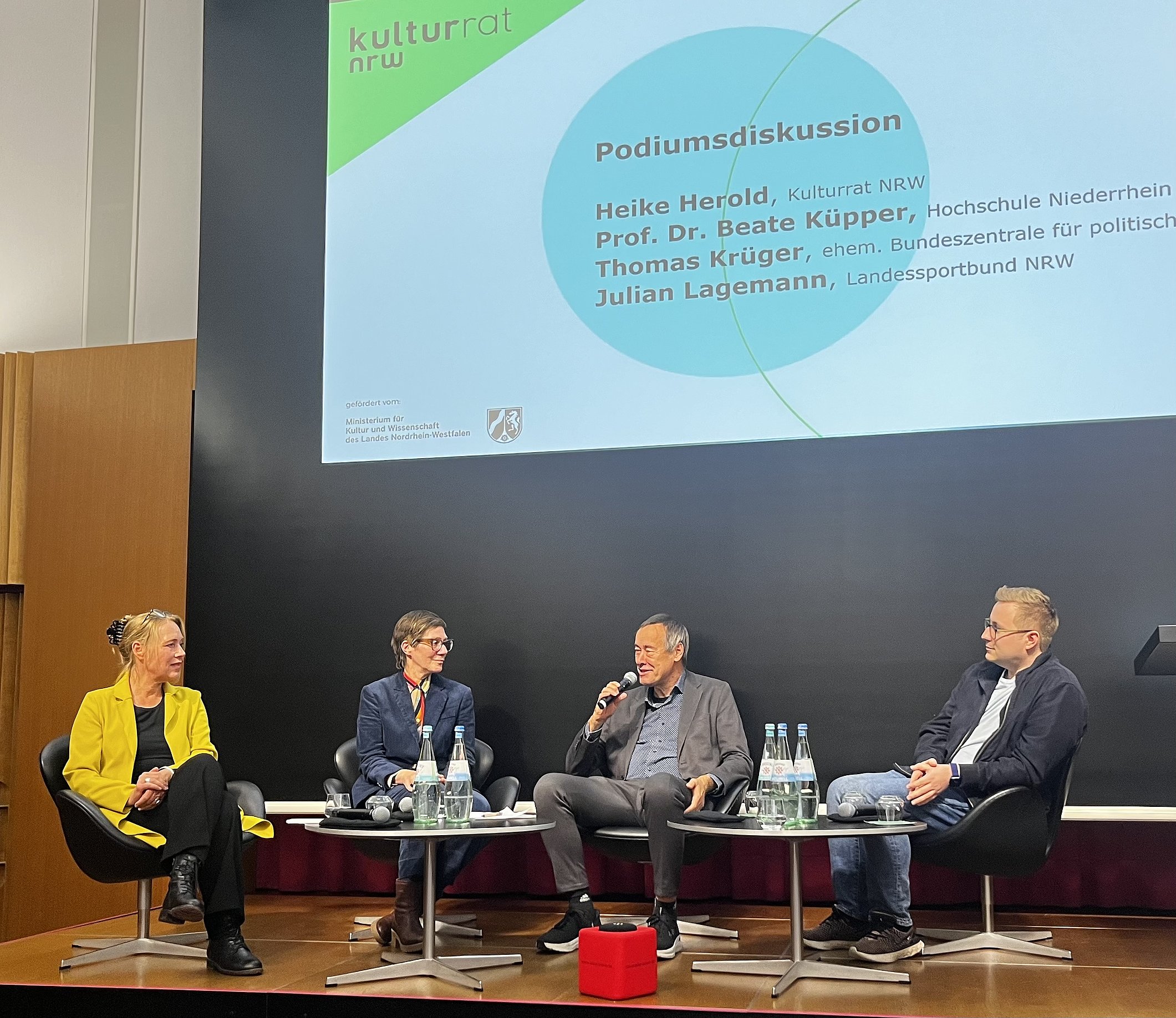 Foto: Beate Küpper, Heike Herold, Thomas Krüger und Julian Lagemann diskutieren Möglichkeiten der Zivilgesellschaft zur Stützung der Demokratie, Veranstaltung des Kulturrats NRW am 24. November 2025 in der Thyssen-Stiftung Köln; Foto: LMR NRW.