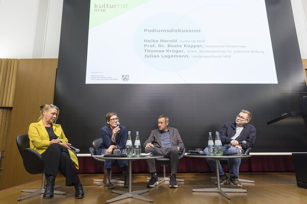 Foto: Innenminister Herbert Reul spricht auf der Veranstaltung des Kulturrats NRW am 24. November 2025 in der Thyssen-Stiftung Köln; Beate Küpper, Heike Herold, Thomas Krüger und Julian Lagemann diskutieren Möglichkeiten der Zivilgesellschaft zur Stützung der Demokratie, Veranstaltung des Kulturrats NRW am 24. November 2025 in der Thyssen-Stiftung Köln; Herbert Reul, Lorenz Deutsch und Matthias Hornschuh; Fotos: Nina Gschlößl.