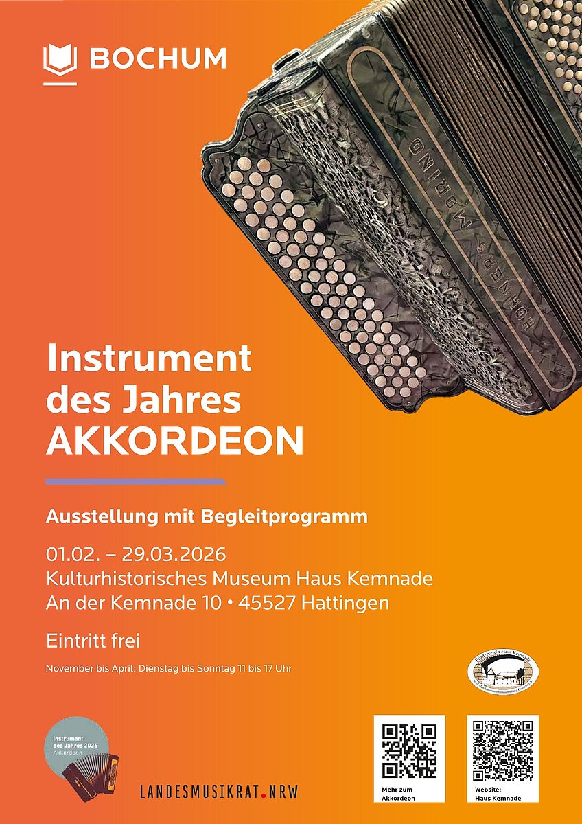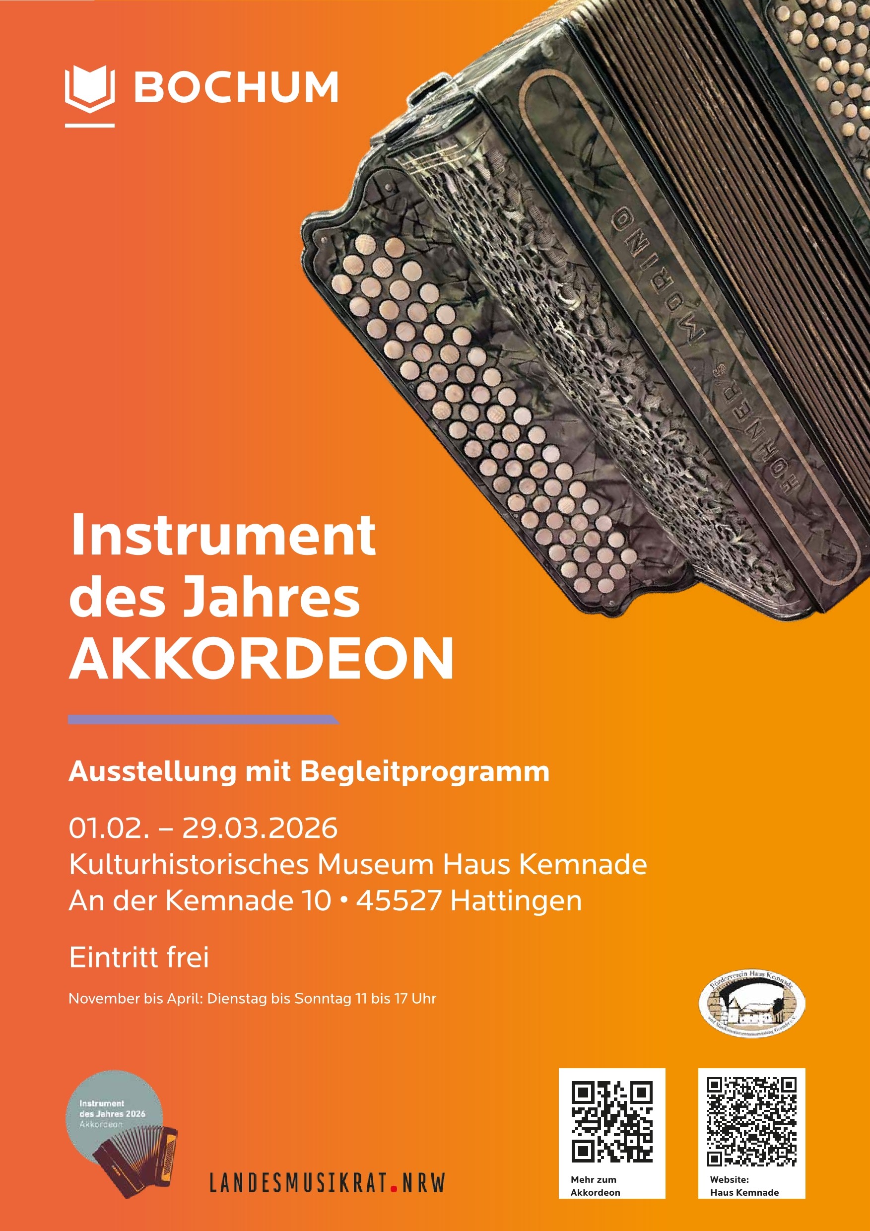 Im Jahr 2026 ist das Akkordeon „Instrument des Jahres“. Anlässlich dieser Aktion der Landesmusikräte zeigt das Kulturhistorische Museum Haus Kemnade vom 1. Februar bis zum 29. März die Instrumentenausstellung „Instrument des Jahres 2026: Akkordeon“. Kurator ist der Essener Akkordeonist Ralf Kaupenjohann, unterstützt von einem Team des Deutschen Akkordeonlehrer Verbandes NRW, Veranstalter die Stadt Bochum in Kooperation mit dem Landesmusikrat NRW. Die Ausstellung zeigt anhand außergewöhnlicher Exponate historische Instrumente, Noten, Fotos und Skizzen. Dazu wird es Begleitveranstaltungen geben, die das Haus Kemnade noch gesondert bekannt gibt. Öffnungszeiten sind Dienstag bis Sonntag von 11 bis 17 Uhr, der Eintritt ist frei.