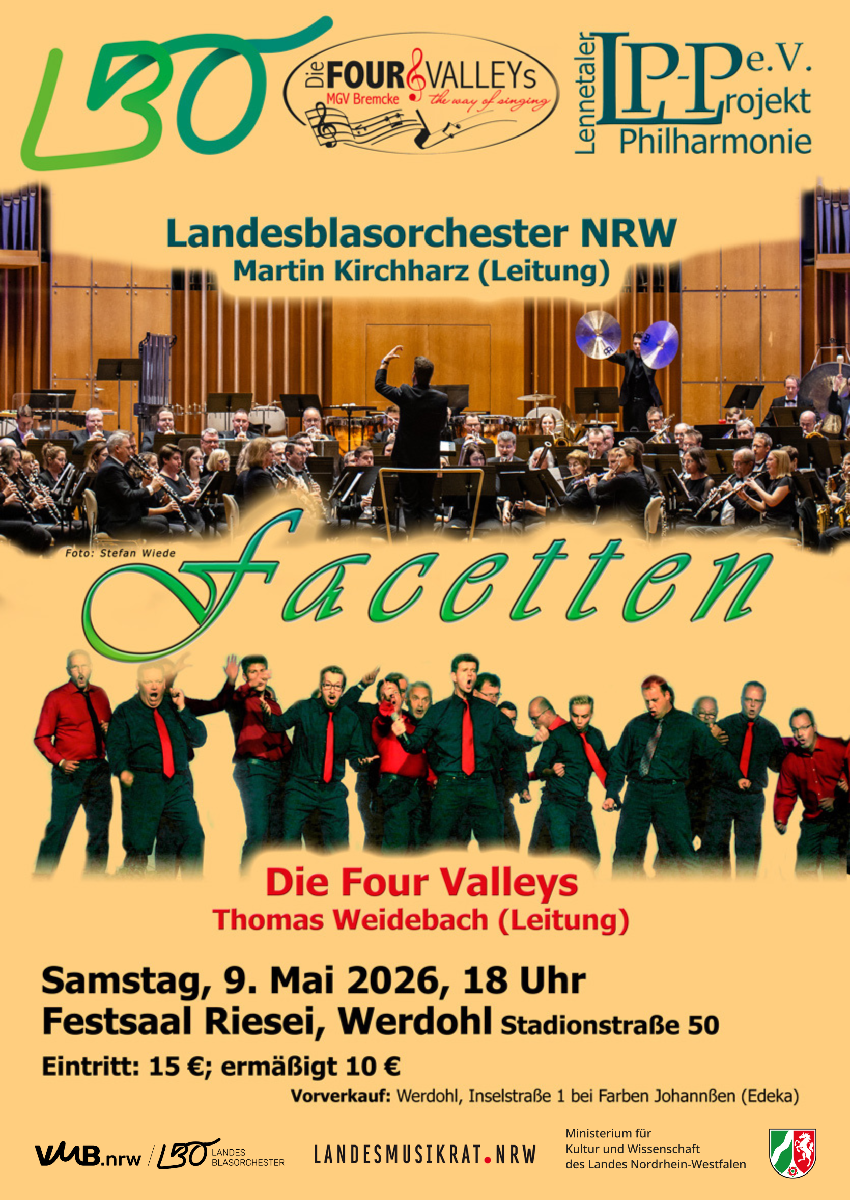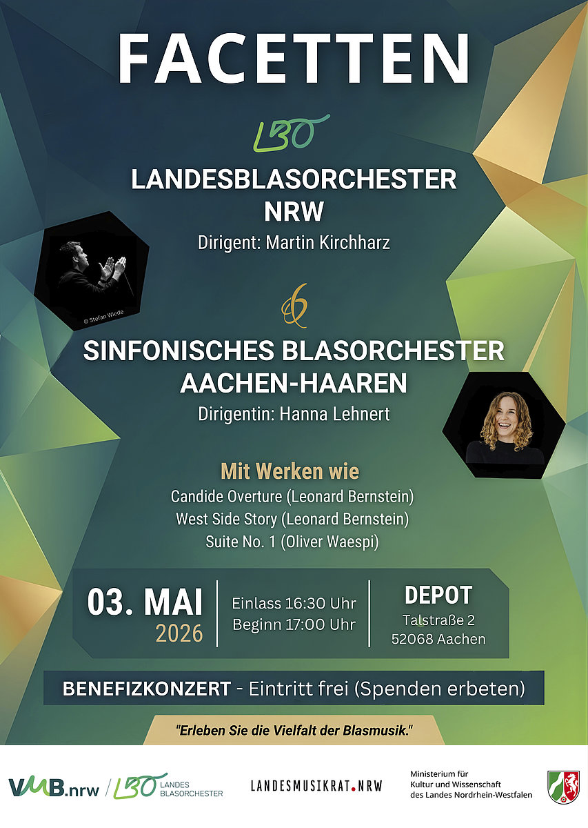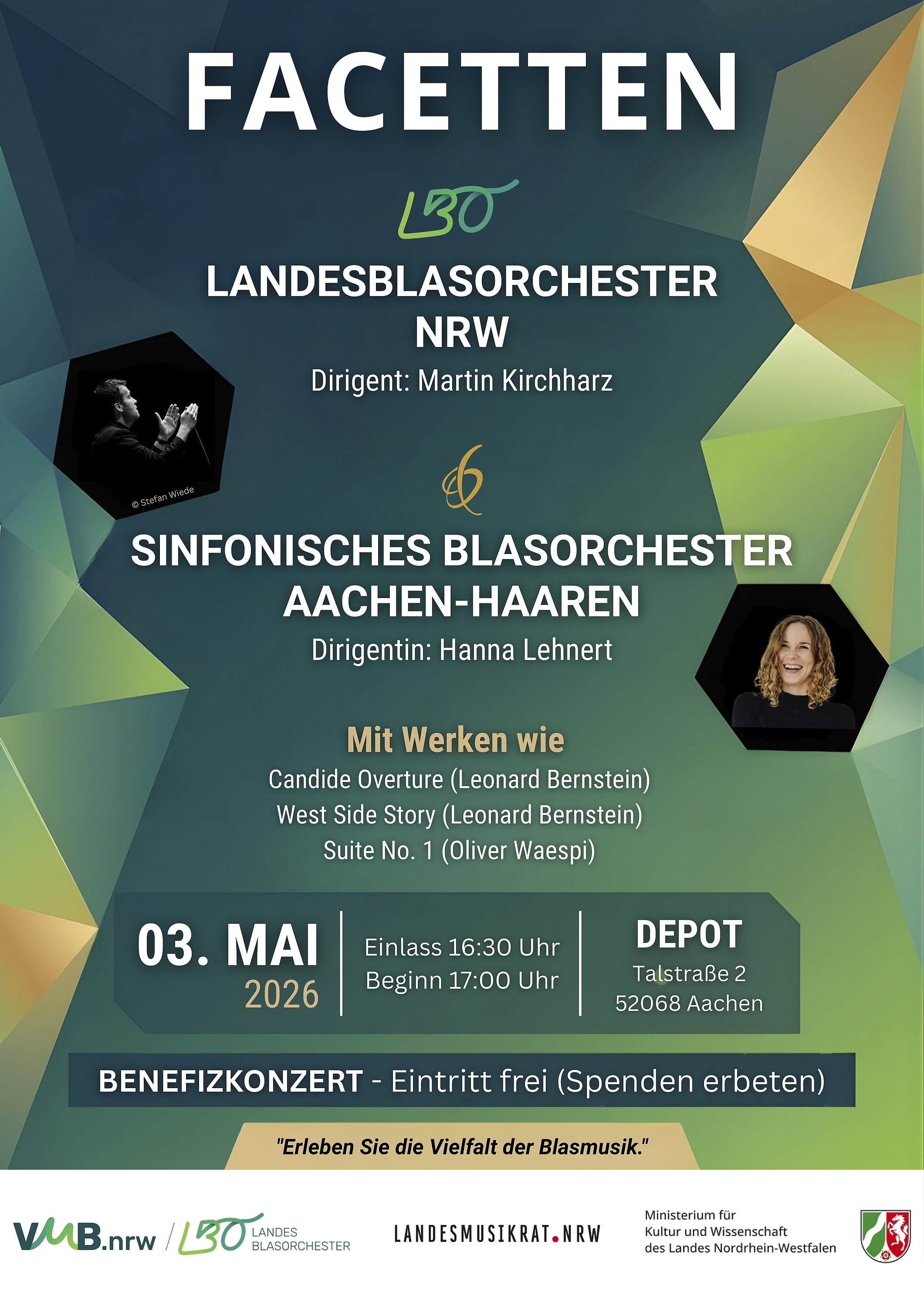 Unter dem Motto „Facetten“ zeigt das Auswahlorchester des Verbands für Musik und Bildung NRW, wie vielfältig und ausdrucksstark sinfonische Blasmusik sein kann. Auf dem Programm der Frühjahrsprojektphase 2026 stehen dabei Werke von Leonard Bernstein, Oliver Waespi und Jan Vander Roost.