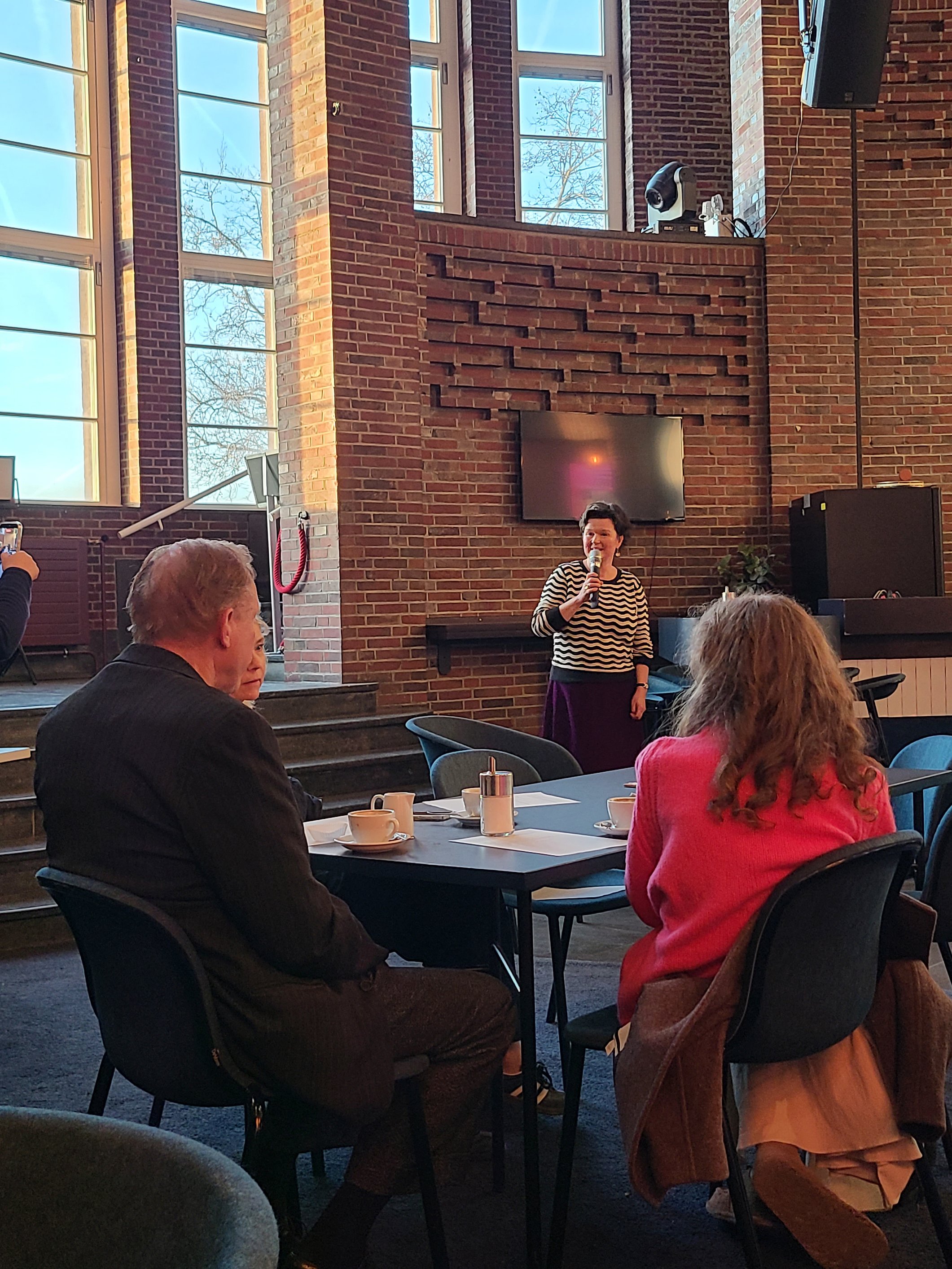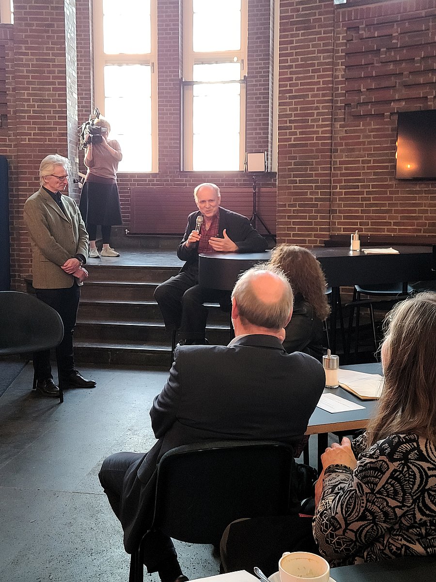 Ein besonderer Höhepunkt des Empfangs war das Gespräch mit Ulrich Tukur, der als Schirmherr für Nordrhein-Westfalen wirkt. Im Dialog mit Robert v. Zahn und im Austausch mit den Gästen sprach Tukur über sein persönliches Verhältnis zum Akkordeon, über seine musikalischen Wurzeln und über die besondere emotionale Kraft dieses Instruments. Er beschrieb das Akkordeon als ein Instrument, das Nähe und Direktheit herstellen könne, das sowohl zum Erzählen von Geschichten als auch zum Ausdruck großer musikalischer Tiefe geeignet sei. Seine Schirmherrschaft versteht er als Einladung, das Akkordeon neu zu entdecken, Vorurteile abzubauen und seine enorme stilistische Bandbreite wahrzunehmen.