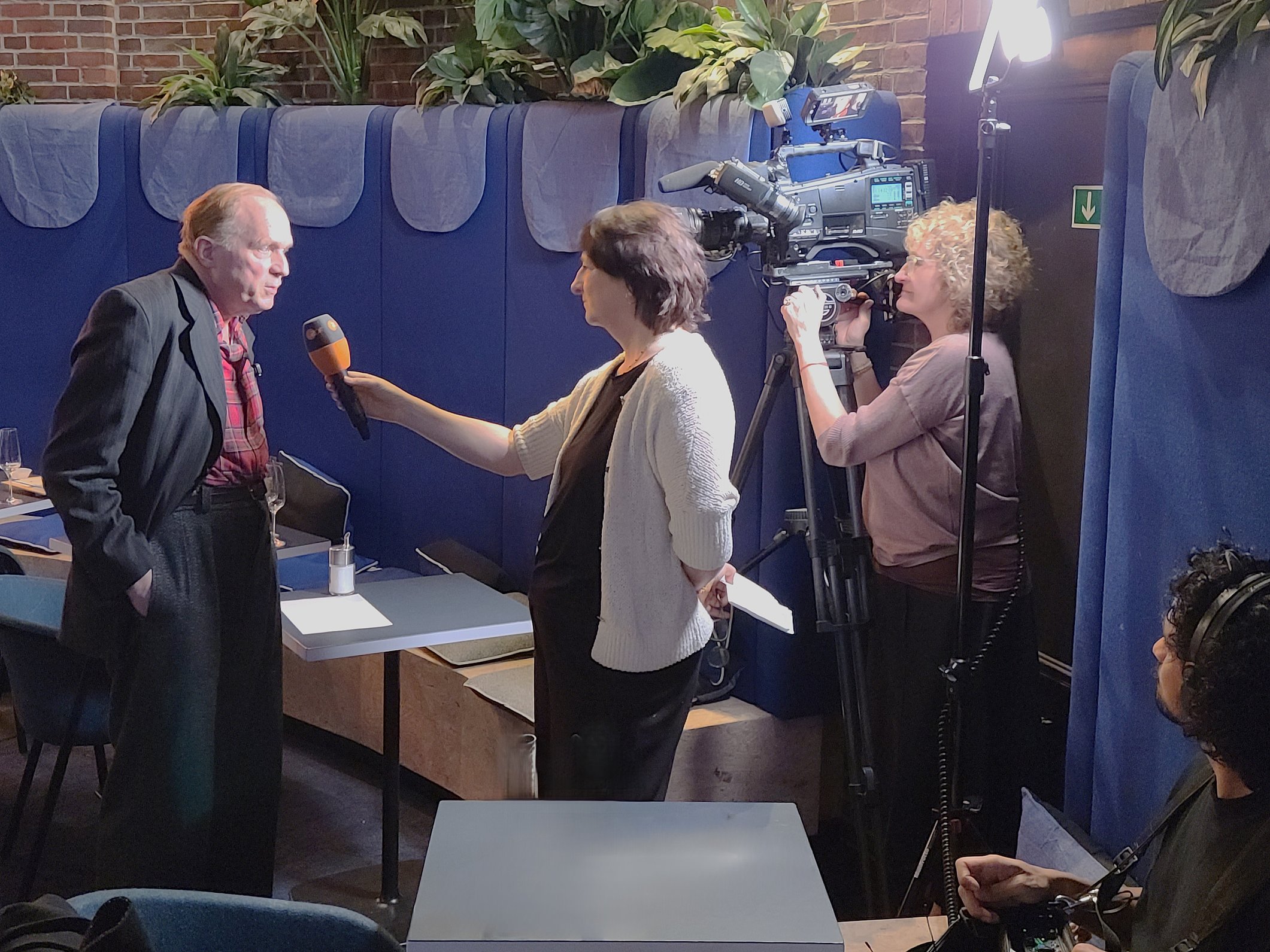 Foto: Ulrich Tukur im Gespräch mit einem Team des ZDF im Pong, NRW-Forum Düsseldorf, 17.1.2026 ; Ulrich Tukur im Interview mit Robert von Zahn ; Tatjana Pereswetow, Vorstandsmitglied des Deutschen Akkordeonlehrer-Verbandes NRW ; Matthias Hennecke, Vorsitzender des Deutschen Harmonikaverbandes NRW ; Claudio Huerta Honores, Akkordeon. Fotos: LMR NRW.