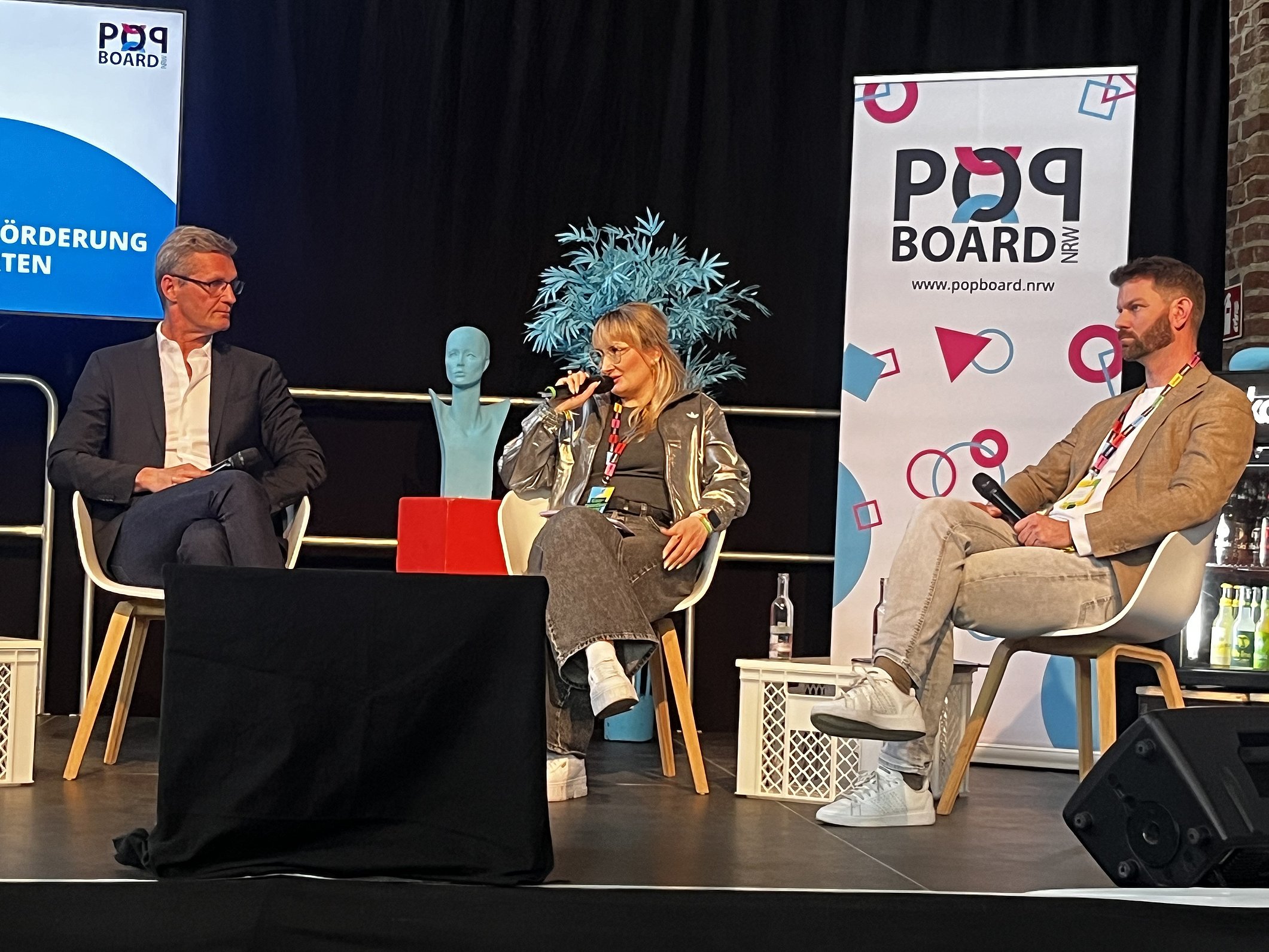 Foto: Frank Jablonski, Anna-Kathrin Dietrich und Florian Braun diskutieren über das, was der Popstandort NRW braucht. Panel des Popboards NRW auf der c/o pop am 17. April 2026. Foto: LMR NRW.