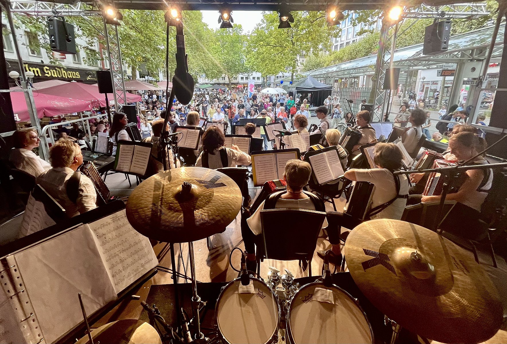 Foto: Bühne auf dem Remigiusplatz bei der Eröffnung des Beethovenfestes Bonn 2025 mit dem Workshop-Orchester "Gemeinsam musizieren mit Quetsch". Foto: Olek Gelba